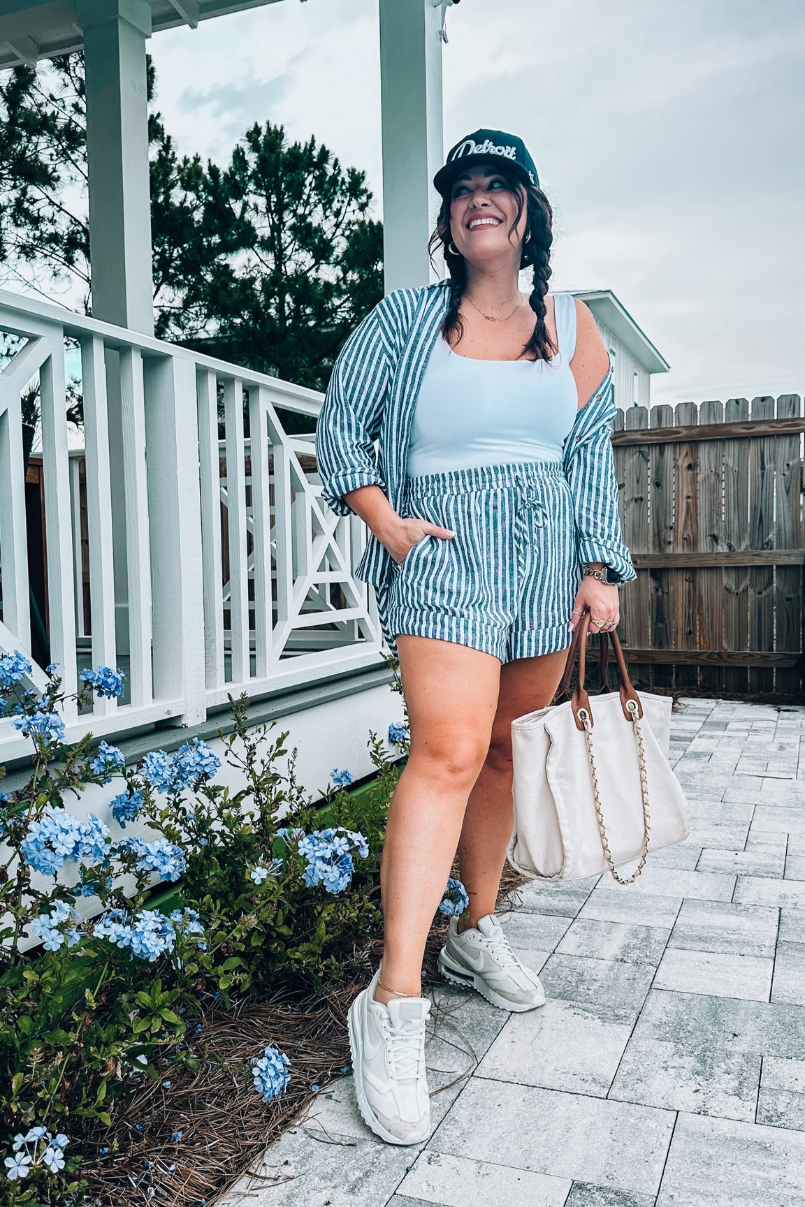 Neutral shorts balance colorful or textured tops, and comfortable flats makes things practical. I usually save this outfit for afternoons that turn into evenings.